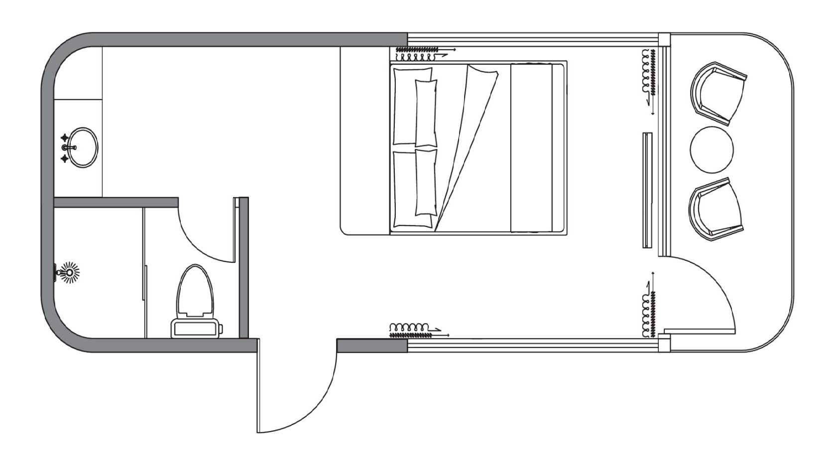 Умный макет упаковывает ванную комнату, сна и хранение в ограниченном пространстве.